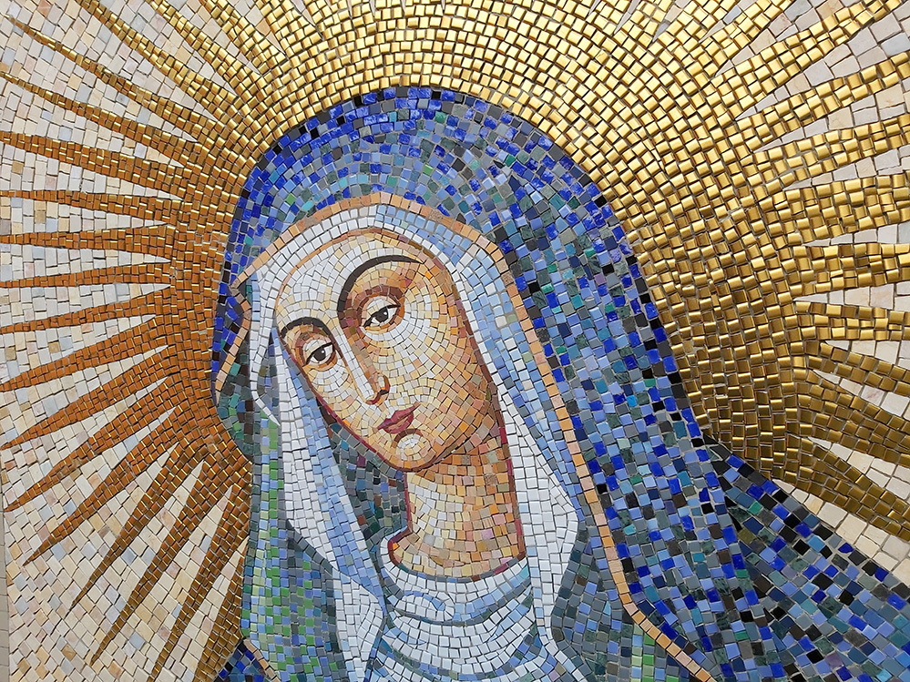 Matka Boska Ostrobramska, 2024, mozaika, fragment, kościół pw. M.B. Miłosierdzia - Ruciane Nida